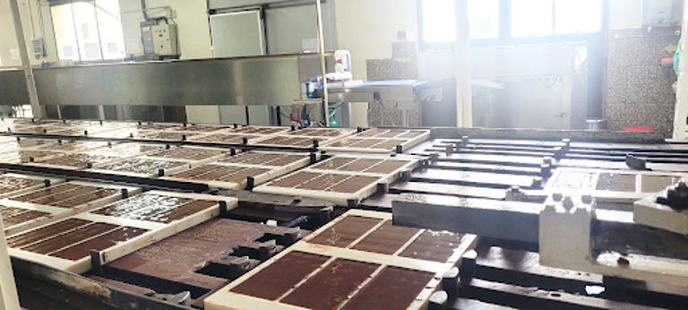 Production de barres chocolatées. Après la trempe, les tablettes de chocolat passent par un tunnel de refroidissement et sont retirées de leurs moules.