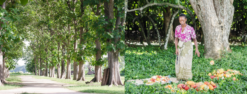 Les cacaoyers s'y épanouissent disséminés à travers les différentes fermes de la plantation à l'ombre de grands arbres.